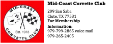 The club continues to be active with our charities: BACH (Brazoria County Association for Children with Handicaps), Brazoria County Gathering Place Interfaith Ministries, Texas EquuSearch and SPCA of Brazoria County. The club has its own ÒbrickÓ at the Corvette Museum, and many members participated in the CorvetteÕs 50th Anniversary celebration in 2003. We co-sponsor an NCCC event each year in Waco, Texas, with the Cen-Tex CC, and host the annual Heritage Day Car and Bike show in the Brazosport area. The club has evolved from its inception, languished for a few years, but has been back in action for the last 28 years. During this time things have changed, but all members still enjoy the camaraderie associated with Corvettes.
